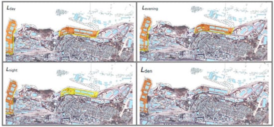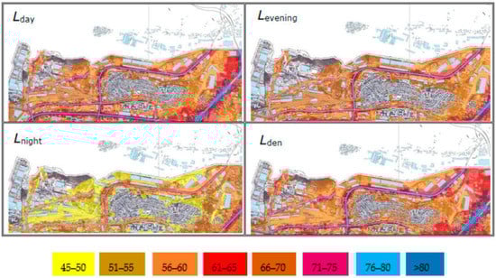 Strategic maps of industrial noise sources in the evaluation periods (Lday, Levening, Lnight, Lden) * [55]. * noise indicator class (dB) as in Figure 4.