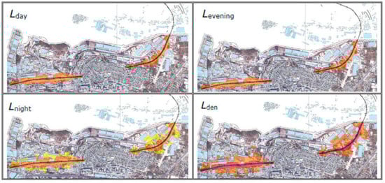 Strategic maps of rail noise sources in the evaluation periods (Lday, Levening, Lnight, Lden) * [55]. * noise indicator class (dB) as in Figure 4.