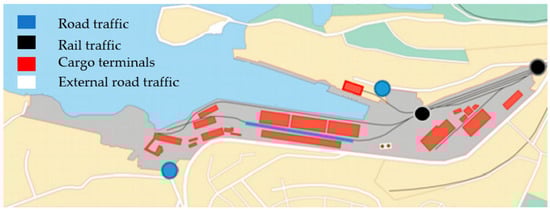 The noise sources can be primarily categorized as traffic or industrial [26]. These categories represent the broader aspects of activities in a port, containing different individual components that should be analyzed holistically to determine their contribution to overall noise damage. The characterization of single noise sources in the study location can be elaborated following the methodology reported in Fredianelli et al. (2021). This approach divides the noise sources into five macro-categories as follows: road, railway, ship, port, and industrial. During noise-source determination in ports, it is important to provide a distinction between the traffic noise originating from activities inside the port area and those generated outside the boundaries of the observed port basin. Thus, in dealing with the noise sources, the research area’s physical extent needs to be defined thoroughly in order to allocate the responsibility for generated noise in the complex geographical environment and to apply the proper mitigation measures. The strict separation of traffic-related sources is occasionally sorely missed, as sometimes port and urban traffic activities are merged. This demonstrates the complexity of port noise source segmentation and their impact on the environment and the local community. According to suggestions from Fredianelli et al. (2021) [8], traffic-related noise in ports includes internal, external, and external (urban) traffic dissociated from the port area. The industrial noise in the port area is related to the remaining port activities that are usually a constituent part of its functions and geographical position, comprising manufacturing activities, shipbuilding, free trade zones, workshops, and other industrial-related areas. During the first quarter of 2022, the monitoring campaign was performed to make a database of all the individual noise sources in the cargo terminal, including port surroundings. Database creation is an essential step in identifying critical points.