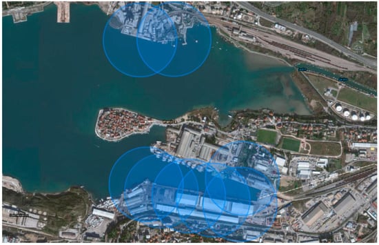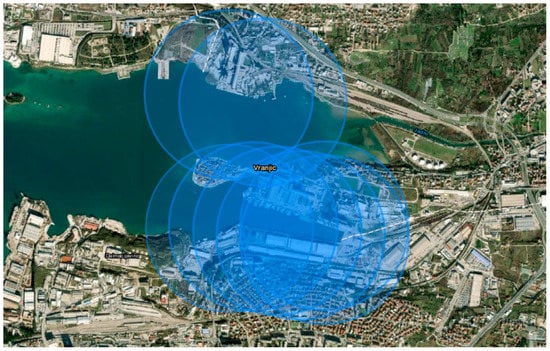 The authors assumed ideal conditions as the theoretical propositions of the port terrain, such as a flat surface without obstacles, e.g., objects, buildings, warehouses, cargo-handling equipment, traffic infrastructure, and other resources used for traffic and industrial activities. In a later stage, simulation results will be compared with real-world measurements and used to formulate the main conclusions. When performing on-site measurement—due to the configuration of the cargo terminal and distances between residential buildings and port infrastructure—it is necessary to consider all the physical obstacles contributing to the reflection, refraction, diffraction, and absorption of noise, as well as other facts which possibly influence the final results. On-site measurement is the principal research procedure. The noise measurement protocol for moored ships was the output and guideline of the NEPTUNES project aiming to standardize the measurement process of airborne noise emission in ports, so future measuring should comply with the best-practice instructions [33]. Figure 3 represents the complex geography of the cargo terminal in the port of Split, surrounded by residential buildings in the southern part and the inhabited peninsula in the northwestern one.