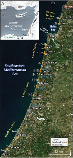 Beachrock outcrops are abundant along most of the Mediterranean coast of Israel, both on sandy and rocky beaches. Overall, 30 sites of BR outcrops are reported here in detail, with particular emphasis on the Sharon coast (between Herzliya and Hadera River) and the Carmel coast (between Hadera River and the Carmel headland) (Figure 2).