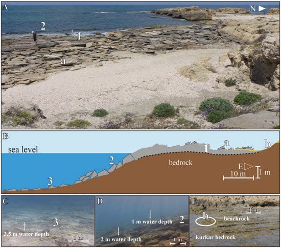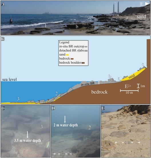 Beachrock exposure at Beachrock Cove site, north of Dor: (A) view of the site (1: BR outcrop; 2: broken BR slabs at sea side, (a) BR slabs scattered on shore); (B) schematic cross-section of the site (VE = 4, 3: BR plates paving seafloor at about 3.5 water depth, (b) BR: bedrock contact backshore, dotted line marks uncertain unit contact depth, other notes are as in (A)); (C) close-up (looking south-west) of BR exposure sea side edge (3: as in (B)); (D) close-up (looking north) of BR exposure sea side of the BR outcrop (2: as in (A,B)); (E) close-up (looking south-west) of BR–bedrock contact backshore ((b) as in (B)).