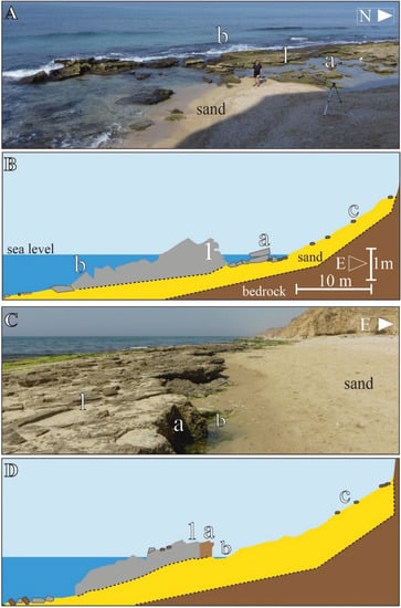 Beachrock of the southern Sharon beaches: (A) view of the Arsuf I site (1: in-situ BR outcrop, (a) clast of BR boulders, (b) sea side ledge of the BR exposure; (B) schematic cross-section of the outcrop (VE = 4, (c) kurkar boulder backshore, other notes are as in (A), dotted lines mark uncertain depth of unit contacts); (C) view of Arsuf II site (1: in-situ BR outcrop, (a) elongated kurkar platform bordering the BR outcrop at land side front, (b) shallow trough); (D) schematic cross-section of the site (VE = 4, (c) kurkar boulder backshore, other notes are as in (C), dotted lines mark uncertain depth of unit contacts).