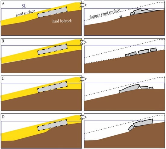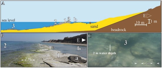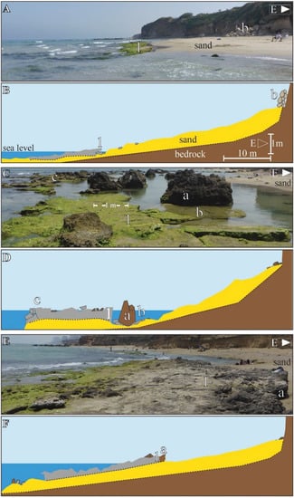 Beachrock (BR) is a rocky formation characterized by the significant presence of marine-associated clasts, such as coarse sand and broken shells, rapidly cemented by calcium carbonate within the intertidal zone. Beachrock is relatively common, and most reported BR occurrences are on tropical and subtropical micro-tidal coasts [1,2,3,4]. A BR outcrop represents fossil bulk sediment (Figure 1A), consolidated while buried beneath the former beach face (the terminology used to describe the beach profile in Figure 1 is after [1]). Exposure of the buried BR in the swash zone is likely to occur at a later stage (Figure 1B,C), following the erosion of overlying unconsolidated sediments [5,6,7,8,9].