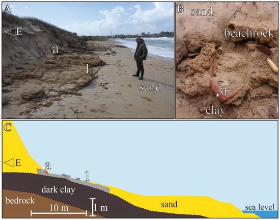 Beachrock exposure near the Crusader cemetery at Atlit: (A) view of the site (1: BR outcrop, (a) ceramic jar consolidated inside the BR); (B) close-up (looking east) of outcrop surface ((a) as in (A)); (C) schematic cross-section of the site (VE = 4, dotted line marks uncertain unit contact depth, other notes are as in (A)).