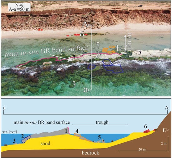 The beach of Atlit Bay (50–150 m wide) separates the Bay and Dor trough (situated between the Dor coastal kurkar ridge and the Atlit ridge) in the south and between the Bay and the Megadim trough (situated between the Megadim and Atlit kurkar ridges) on the east. The narrow beach profile (Figure 9) in the Atlit II site is bordered at the backshore by a wall, supporting the terrace of a Crusader cemetery [40]. Toward the south, the beach has been altered by construction. The steep beach profile consists of loose, fine, well-sorted, crushed bioclasts and quartz sand. Storms revealed the BR (Table 1: 27) outcrop (up to 0.2 m thick, of moderate–weak cementation level bed), lying on a dark clay layer [71] and characterized by its surface micro-topography. Furrows cut the BR outcrop surface here. Many fragments of ceramic vessels were found inside BR in this site, including part of a ceramic cone-shaped jar dated to the 7th–8th centuries BC [72] (p. 492) cemented inside the BR bed. The BR band is situated in the upper intertidal zone at about 10–15 m from the shoreline. Detached blocks are piled on top of the outcrop and backshore.