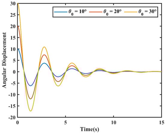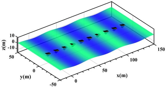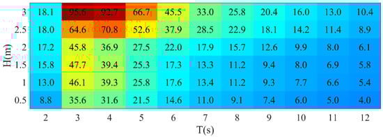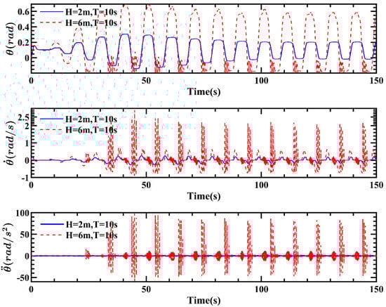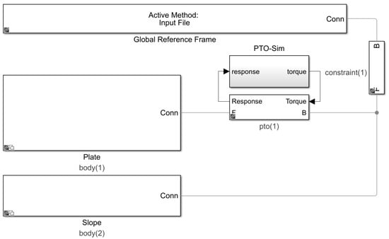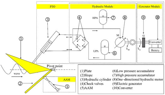 - is the damping torque of the hydraulic power take-off.where is the pressure difference in the hydraulic rod, is the cross-sectional area of the hydraulic rod, and is the distance from the intersection of the hydraulic rod and the floating plate to the pivot point. Assuming that the hydraulic rod is always perpendicular to the floating plate, and the nonlinearity of the PTO is not considered, the influence of the nonlinear PTO on the wave energy capture efficiency will be studied in future work.