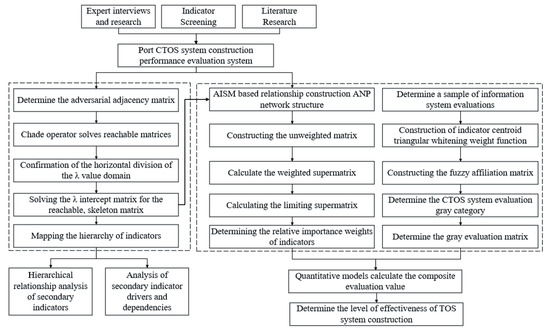 This paper is organized as follows: in Section 1, a literature review on the adversarial interpretive structural modeling (AISM) and analytic network process (ANP) methods is conducted, and a joint AISM-ANP solution is proposed. Section 2 constructs a construction performance evaluation model for the CTOS. Section 3 introduces the improvement scheme of the two algorithms and the joint application of the solution method. The case study in Section 4 introduces the gray clustering method (GCM) quantitative evaluation model to quantitatively evaluate the CTOS of the Qinzhou Collective Division. Section 5 concludes and discusses using the proposed quantitative evaluation extension scheme for all information systems in smart ports.