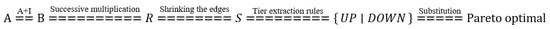 - UP type. The UP-type hierarchical diagram, i.e., result-first hierarchical division, has the extraction rule T(e) = R(e). For DAG diagrams without loops, the operation can be performed with matrix S + I, i.e., the skeleton matrix in which the main diagonal is filled with one repetition of the same reachable set as the common set on the extraction of the elements. The extracted elements are placed on top each time, and the extracted elements are placed in a top-down manner.