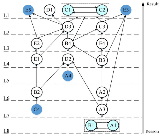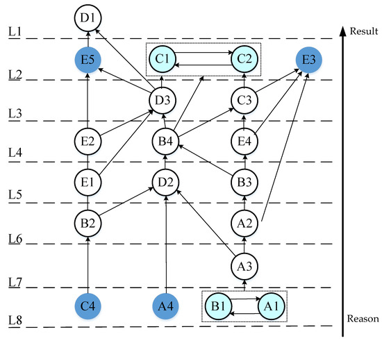 The four different result-first, cause-first, result–cause rotation, and cause–result rotation hierarchical extraction rules can be used to obtain the hierarchy in which the elements are located. Then, the directed edges of the skeleton matrix are iteratively regressed, which means that a directed topological hierarchy map can be drawn.