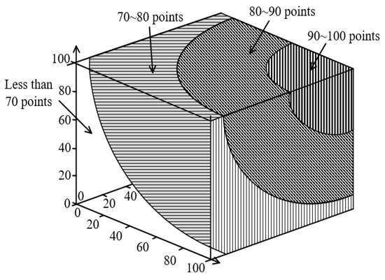 Set as the center point of the center point of the first gray class and connect the center point of the first gray class with as the center point of the first gray class and the center point of the first gray class to obtain the indicator for . The triangular whitening weight function of the gray class is , where when , the lower bound triangular whitening weight function is used, extending to the left; when , , the upper limit triangular whitening weight function is used to extend to the right, and the extension range is [0, 100]. For the score x of index j, the corresponding gray class of the whitening weight function can be separately calculated using Equation (11).