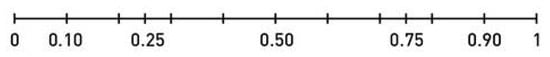 The method used for allocation of values was the probability scale, as shown in the Figure 2. A probabilistic scale is a horizontal or vertical line with numerical values. The values offered to the experts were: (0.1, 0.25, 0.5, 0.75, 0.9).