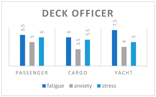 Figure 3 shows that the highest values of anxiety and stress were reported by seafarers serving as deck officers on passenger ships, while the highest value of fatigue was reported among the deck officers on yachts.