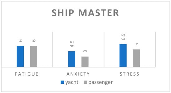 Furthermore, according to the results of the survey questionnaire, the greatest fatigue among the masters is present at the age of 36–55 years. Masters do not indicate significant states of anxiety. Somewhat higher rates of anxiety were reported among the masters on passenger ships and yachts, aged from 26 to 55. The comparative results regarding fatigue, anxiety and stress among the masters on passenger ships and yachts are presented in Figure 4.