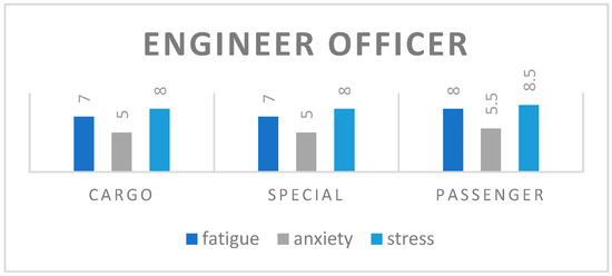 The analysis of data obtained from the engine officers produced fatigue, anxiety and stress rates that are worse than in deck officers. Engine officers aged 26–55 serving on cargo and passenger ships show a very high level of stress and nervousness. Engineers aged 36–55 report considerably higher values of fatigue than their younger peers. The results of the survey analysis show a significant level of fatigue and stress in all engine officers, regardless of the type of vessel they serve. A strong presence of anxiety is also reported in all surveyed engineering officers (Figure 5).