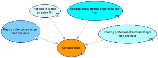 The variable Concentration refers to a person’s ability to direct psychic energy towards a stimulus from the environment. In order to obtain the values of conditional probabilities for this variable, we have observed the effects of the General intensity of Fatigue, Anxiety and Stress and nervousness. The values of the variable Concentration have been obtained through the results produced by the research, based on the responses in the questionnaire. These values are presented in Figure 6 (see the description of the model’s variables in Table 2).