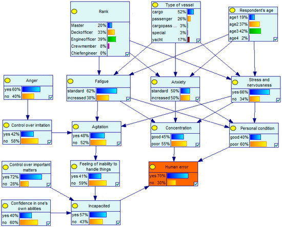 In our study, the most unfavourable combinations that lead to human error were found in deck officers aged 18–25 employed on passenger ships, when they are influenced by the variables Stress and nervousness (77%), Anxiety (75%) and Fatigue (76%). In the event that all three conditions are present in deck officers aged 18–25 employed on passenger ships, the conditioned probability of human error amounts to 81%. In this case, human error can be further intensified by poor concentration, increasing the probability of human error to 83%.