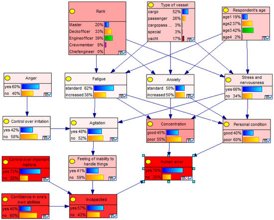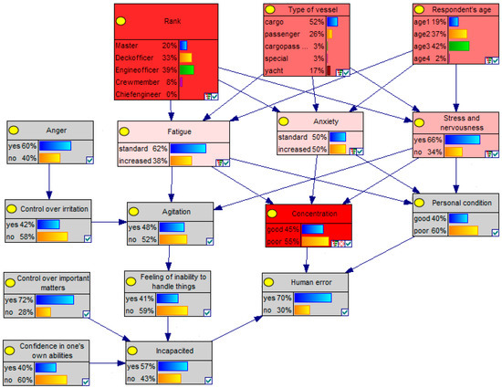The intensity of red colour is proportional to the rate of the variables’ sensitivity. The selected variable is considerably influenced by the variables in red colour, and the strength of influence can be observed by the colour’s intensity. As it can be noticed, the selected variable is strongly affected by the variables Type of vessel, Respondent’s age, Rank on board, Concentration, Personal condition, Feeling of inability to handle things, Control over important matters, Confidence in one’s own abilities and Incapacitated. Detailed values of sensitivity for each variable are shown in Table 3.