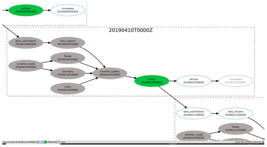 ReOMo contains a set of applications; some are run only once at the beginning of simulation, and others are run repeatedly every model day. The run-once tasks include (i) compilation of Nemo executive module from the source code; (ii) copying pre-processed initial conditions into the work space; and (iii) creation of the original namelist for NEMO computations. The daily repeated tasks include (i) updating of the namelist; (ii) interpolation of meteorological forcing onto the model grid; (iii) preparation of data on river discharges if necessary (LD20 does not include rivers); (iv) execution of NEMO module; (v) data assimilation—LD20_DA does it every five days; (vi) creating the restart file for the next day simulations; (vii) transferring the daily average and 3-hourly instantaneous results from NEMO simulation to the external storage system; and (viii) cleaning the operational disk to prepare space for further simulations. The cleaning is carried out with a five-day delay to allow simple automatic or manual re-run of tasks in case of failure. In order to save time, some tasks (e.g., interpolation of meteorological forcing, preparation of river data, lateral boundary conditions for the next day simulation) are carried out concurrently with or before NEMO model runs.