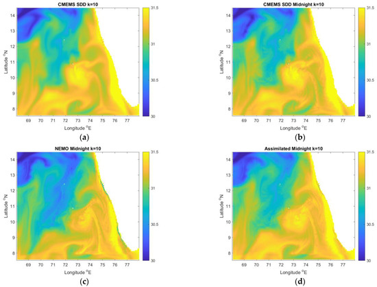 Data assimilation helps reduce the spatial shift of physical features, which is also called ‘the double penalty effect’ [35]. This effect is common when comparing coarse and high-resolution models both in oceanography and meteorology. The ability of model-to-model data assimilation to reduce the phase shift is illustrated in Figure 4. Large-scale features that are resolved by the global 1/12° CMEMS model are presented in LD20_DA in a similar way. For example, the front between warmer and colder waters delineated by T = 31.3 °C isotherm is located at 72° E in the CMEMS model and at 72.25° E in LD20_DA. In contrast, the LD20_noDA model shows the front shifted to the west by nearly 150 km to 70.5° E.