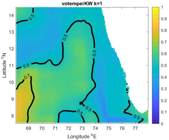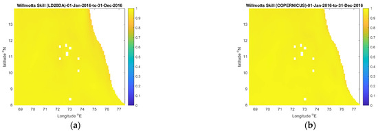 The model skill of LD20_DA was further assessed by computing the spatial distribution of the Willmott skill parameter; see, e.g., [38,39], defined by the equation: