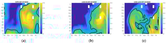 Sea surface temperature for the three models in a zoomed area south of Lakshadweep islands on 4 May 2016: (a) CMEMS, (b) LD20_DA with 5 daily cycle of data assimilation, (c) LD20_noDA without data assimilation. Black contour shows the 31.3 °C isoline.