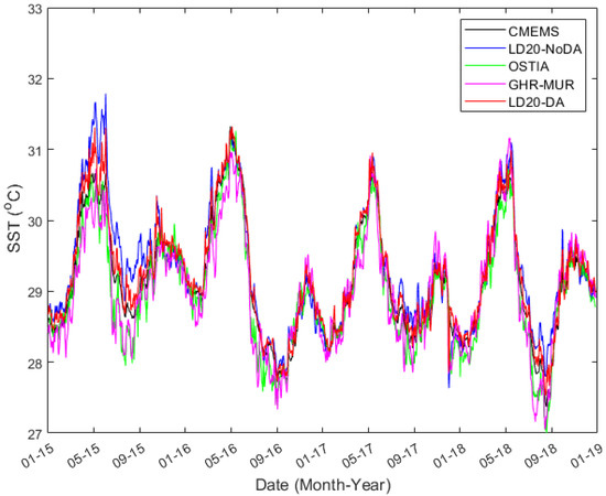The improvement provided by model-to-model data assimilation is particularly seen during the monsoon period (July–September) 2015. The solar radiation used to drive the LD20 models was overestimated during this period and corrected for later dates by the meteorological data supplier [36]. In response to overestimated heat flux, the LD20_noDA was significantly higher, up to 1.5 °C SST compared to OSTIA, while the data assimilating model LD20_DA only shows a difference of up to 0.5 °C.