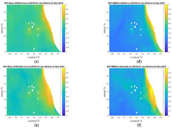 Spatial distribution of time-averaged differences between the models and OSTIA: (a,c,e) bias; (b,d,f) RMSD; (a,b) CMEMS; (c,d) LD20_DA, (e,f) LD20_noDA. Time-averaging period is from 01 January to 31 December 2016.