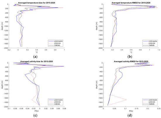 Comparison of LD20_DA, LD20_noDA and CMEMS against Argo float profiles of temperature and salinity: (a,c) bias; (b,d) RMSD; (a,b) temperature; (c,d) salinity. Potential temperature produced by the models is converted to in situ values measured by floats using the Thermodynamic Equation of Seawater-2010. Averaging is done over 401 individual Argo profiles for the period 1 January 2015 to 31 December 2020.
