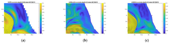 Daily averaged current velocities at the sea surface on 2 February 2015: (a) CMEMS model at 1/12° resolution; (b) LD60_noDA at 1/60°; (c) LD60_DA also at 1/60°. Colour shows the speed of current in m/s.