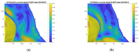 Daily averaged current velocities at the sea surface on 2 February 2015: (a) LD120_noDA; (b) LD120_DA. Colour shows the speed of current in m/s.