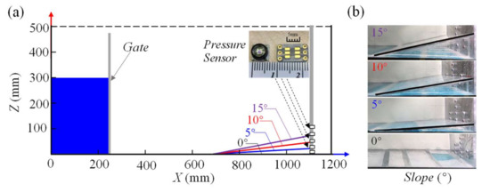 Since Lauber et al. [1] summarized and concluded the experimental criteria for generating ideal dam break waves, the latter have been widely used to investigate the mechanism of tsunami overland inundation, which, over the past decades have caused significant disasters in coastal areas around the world. Extensive research on dam break wave propagation over horizontal beds and the subsequent hydrodynamic impact on structures has been performed by several researchers [2,3,4,5,6,7,8,9,10].