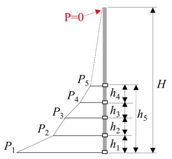 Schematic of the linear dynamic pressure distribution on the right vertical wall with the assumption that P = 0 at the elevation equal to that of initial impoundment depth h0, h1 = h2 = h3 = h4 = 35 mm, H = 300 mm.