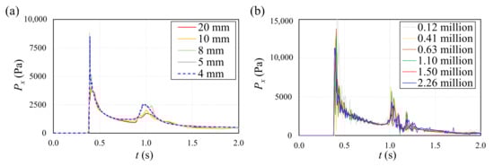 In OpenFOAM simulations, different mesh grids of 20 mm, 10 mm, 8 mm, 5 mm and 4 mm were generated for the computational domain in all directions to investigate the convergence separately. As indicated in Figure 4a, the first peak pressure tended to be steady and the pressure curves coincided more closely when the mesh size decreased from 20 mm to 4 mm. The pressure data from models of 5 mm and 4 mm mesh grids were remarkably similar which indicated that convergent results were achieved. Thus, the mesh grid of 4 mm was adopted for the OpenFOAM simulation.