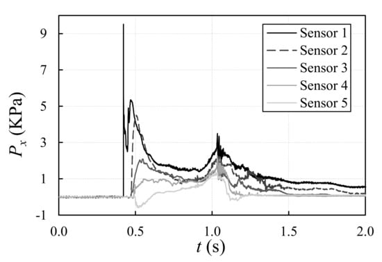 In the experimental study of dam break induced bore propagating over a horizontal bed [36], the time-history of the impact dynamic pressure from the miniaturized transducers 1–5 was measured and these are presented in Figure 5. At initial impact, the pressure quickly reached a first peak value for all transducers except the slightly negative value recorded by transducer 5 due to suction effects caused by the fallback of the tip of the runup wave. After decreasing to a plateau period, a second peak pressure was observed due to the impact of the fallback wave. Afterwards, the time-history of pressure data gradually decreased to zero except for the approximate hydrostatic pressure recorded by transducer 1.