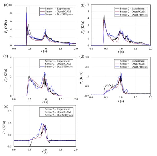 In this study, the dam-break waves propagating over a horizontal bed was reproduced by two models, OpenFOAM and DualSPHysics, to numerically calculate the dynamic pressure at the corresponding transducer 1–5 locations, with the comparison presented in Figure 6. Good agreement was observed except for some slight discrepancies.