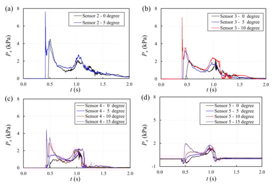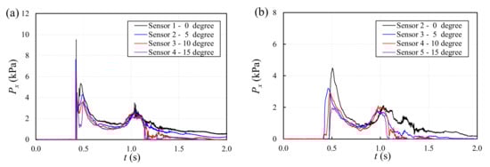 The dam-break experiments were conducted with different bed slopes, showing good repeatability in spite of data noises due to measurement errors which were filtered adequately, i.e., for the instantaneous and sudden small spike on the pressure time-history. During the impact between the vertical wall and dam-break induced bores, the lowest placed transducer will experience the most violent impacts. Figure 7 exhibits the time-history of dynamic pressure from the lowest placed transducers 1 which is located at the bottom in the 0-degree case; transducers 2, 3, and 4 became the lowest placed ones for the 5-, 10-, and 15-degree cases, respectively, as in the schematic showing the experimental apparatus in Figure 2.