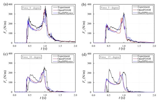 Comparison of the time-history of the impact force on the vertical wall from experiment and numerical simulations using the OpenFOAM and DualSPHysics models: (a) 0-degree case; (b) 5-degree case; (c) 10-degree case; (d) 15-degree case.