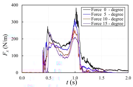 The force comparison presented in Figure 9 revealed that the maximum experimental impact force generated by the dam break wave occurred during the second peak at approximately 1.0 s when the surge fell back along the wall [36] instead of at the initial impact, with maximum values of 383.7 N/m, 314.5 N/m, 262.23 N/m in the 0-, 5-, and 10-degree slope, respectively.