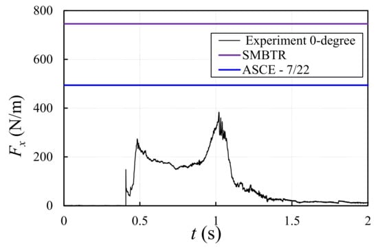 Overall, the magnitude of the impact force decreased in steeper slope cases, except the overestimated first peak force at approximately 0.5 s for the 15-degree slope. Considering the numerical simulated force as 150 N/m at the first peak for the 15-degree slope, the maximum impact force at the first peak was 91.38 N/m, 104.4 N/m and 130.82 N/m lower than the horizontal case for the 5-, 10- and 15-degree slopes, respectively. The maximum impact force of the dam break wave occurring at approximately 1.0 s decreased by 18.04%, 31.66% and 45.19% in the 5-, 10- and 15-degree cases, respectively, when compared with the value of 383.73 N/m for the horizontal bed case. There was also a decrease in the force for the sloped beach cases during the plateau period between the first and second peak at approximately 1.0 s, which dropped by an average of 20 N/m, 50 N/m and 65 N/m from the 5- to 15-degree cases when compared with the horizontal bed case. In addition to the numerical comparison, the integrated force in the horizontal bed case was also compared with the forces calculated using the provisions of SMBTR [15] and ASCE-7/22 [20] to evaluate the applicability of the simplified estimation method, as indicated in Figure 11.