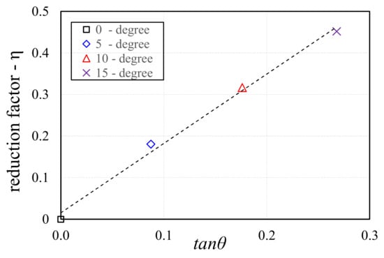 To investigate the relation between force, decrease and bed slope, the decrease ratio in Section 4.6 was defined as a dimensionless reduction factor , together with the tangent values of bed slope presented in Figure 12.