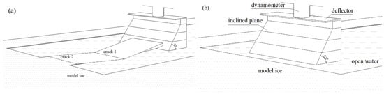 To obtain the broken ice images for the photogrammetric study, experiments were performed in the ice tank of Krylov State Research Centre (KSRC), St. Petersburg. In all the experiments, a 700 mm wide model with a frontal wall inclination of 53° was used (Figure 1). The experiments were performed according to the principle of inverse motion: The model was towed against the ice floe with a towing carriage, while the floe itself was standing still. No false bottoms were used in the tests. In the first part of the experiment, four large cantilever beams were prepared from the ice floe and broken by the sloped wall of the model at a velocity of 2.5 mm/s (Figure 1a). After the first beam–slope contact, the crack in the beam appeared in about 8 s, then the “support” phase took place, when the broken fragment behaved like a spacer, transmitting stress to the remaining part of the beam and resulting in new cracks. After release, the photogrammetry of the broken fragments that contacted the structure was performed. In the second part of the experiment, level ice sheets imitating a semi-infinite plane were broken by the sloped wall of the structure at velocities of 2.5 mm/s and 5 mm/s (Figure 1b). After the first plane–slope contact, circumferential and radial cracks appeared, generating several fragments. The photogrammetry of these fragments was performed for all the tests, while for the last test, the photogrammetry of the ice pieces observable during the evolution of rubble piles in the continuous ice–structure interaction was performed.