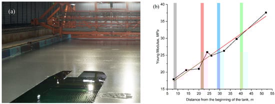 (a) The overview of an ice model’s cantilever beam prepared for an experiment and (b) variations in the elastic modulus of the ice model throughout the length of Floe 1: black points—measurements, red line—fitted linear tendency, colored rectangles—positions of cantilever beams.