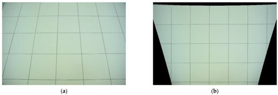 where is the distance of the pixel from the distortion center in the distorted image, while the new undistorted position of this point is , and is the parameter of radial distortion, which for the images from NIKON D800, happened to be −0.069. The undistorted orthorectified calibration image is provided in Figure 3b.