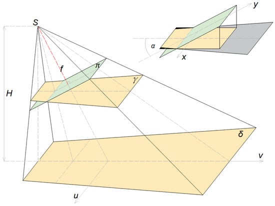 Geometric orthorectification of the image taken from the inclined position: is the image inclined on angle to the scene plane , while is the plane with the orthorectified image.