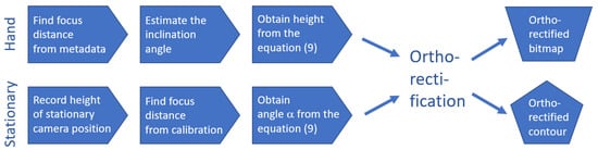 However, if is unknown, this approach does not help. Though with known and , the system of these two parameters in Equation (9) with unknown can still be formulated, it is too complex. Thus, for hand camera images with both unknown angle and height but with a template object in the scene, the brutal force search of the inclination angle in the expected range of values was performed first, and the evaluation of from (9) was made afterward. The summary of the approaches implemented for the orthorectification of hand and stationary camera images is outlined in Figure 5.