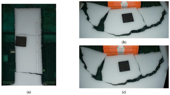 “Plane 3” test: (a) broken ice blocks when the structure moved in the channel, showing the orthorectified scene on the slope of the structure in the video frame at 02:16; (b) broken blocks ejected away or slipped down the rubble pile, showing the orthorectified scene on the ice sheet surface in the video frame at 04:28; (c) after-test nadir drone view of the polynya.