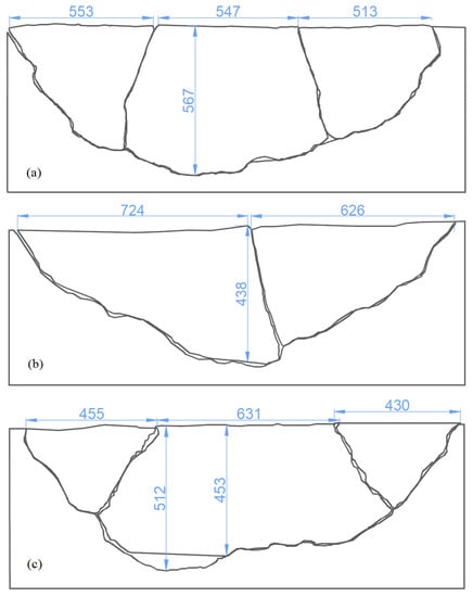 In Figure 7, the drawings of the broken ice beams’ free ends are provided as a result of the orthorectification and contouring of the original images. The largest and smallest longitudinal dimensions, as well as the widths, were restored from the images and are provided in the figure in mm. The reconstruction of ice plane failure in the episodes of a sloping structure encounter was carried out using NIKON D800 pictures of the floating fragments (Planes 1 and 2) and using GoPro video frames (Plane 3). All the images required orthorectification, after which the dimensions of the fragments were evaluated, and their mosaic was put together, thus reconstructing the cracks in a broken plane.