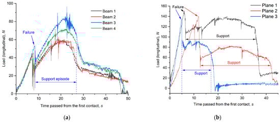 Longitudinal loads recorded: (a) at velocity of 2.5 mm/s in experiments with Beam 1 (black), Beam 2 (red), Beam 3 (blue), and Beam 4 (green); (b) in experiments with ice planes at velocity of 2.5 mm/s, Plane 1 (black), Plane 2 (red), and at velocity of 5 mm/s, Plane 3 (blue).