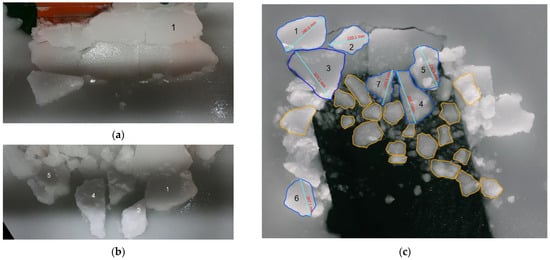 After orthorectification, manual tracing was used to obtain the contours of the ice pieces. This ground truth approach for ice visual analysis has been in practice since the 1980s [40]. It should be noted that the experiment in the ice tank was carried out with artificial illumination using a variety of light sources, which led to flares. Furthermore, the ice fragments, due to being soaked and submerged in water, changed their color to a darker one, which hindered the accurate recognition of the boundaries of a floating ice object. For the case of “ice on ice” (rafted ice or an ice rubble pile), the positions of some contours could only be guessed, leaving much uncertainty in the resulting dimensions. In addition, the ice surfaces not parallel to the orthorectification plane were misshaped: an example of this contortion can be seen in Figure 6c for the ice thickness visible at the utmost left ice fragment.